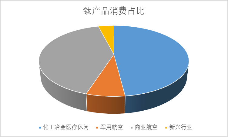 目前世界钛应用量最大的依然是航空航天领域,用量占总消费量的48%。钛在民用工业和消费领域的应用发展的非常快,也占世界总消费量的48%。新兴行业约占4%。