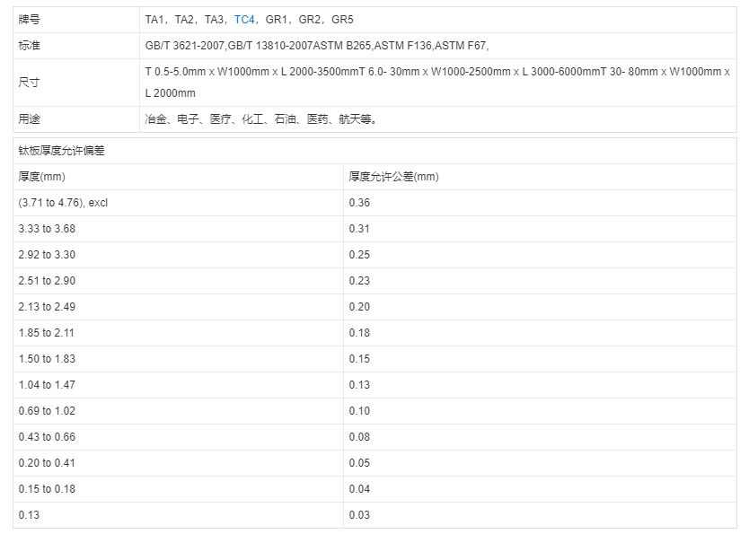 牌号美标牌号:GR1、GR2、GR3、GR5、GR7、GR12 俄标牌号:BT1-00、BT1-0、BT1-2等 国内牌号:TA0、TA2、TA3、TA5、TA6、TA7、TA9、TA10、TB2、TC1、TC2、TC3、TC4 一引用标准 1: GB 228金属拉伸实验方法 2: GB/T 3620.1钛及钛合金牌号和化学成分 3: GB/T3620.2钛及钛合金加工产品化学成分及成分允许偏差 4: GB 4698海绵钛,钛及铁合金化学分析方法